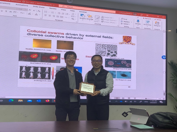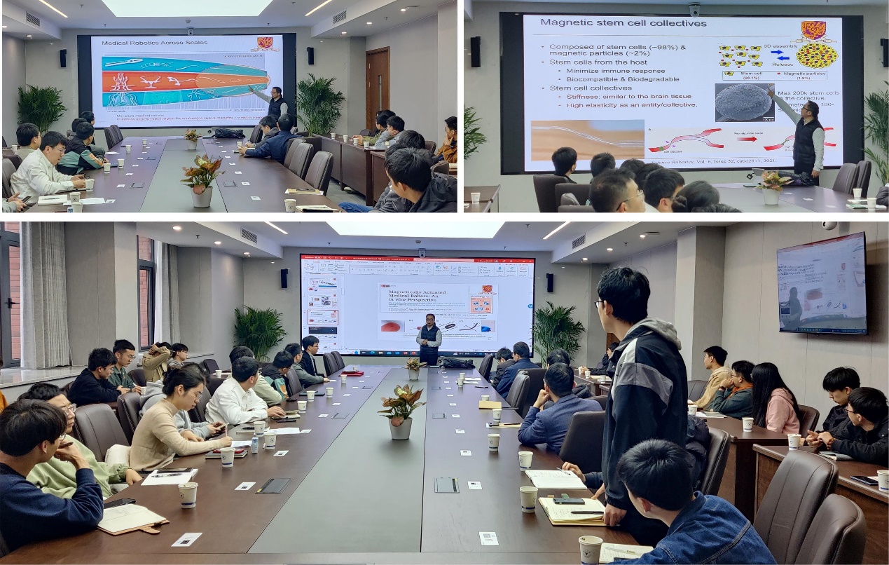 香港中文大学机械与自动化系张立教授应邀在论坛上作了《医用磁控微纳机器人:从个体到集群》的精彩报告。张立教授以诺贝尔奖得主理查德·费曼先生1959年提出的微纳机器人概念为引,详细介绍了这种可以小至微纳米尺度的机器人执行器,他们能将多种多样的能量转化为动力,成为人类在微观世界中的“双手”。在本次报告中,张立教授阐释了运用磁场技术来控制微型医疗机械人进行诊断和手术这一医疗机器人学的研究热点,并基于课题组近五年发表在《Science Robotics》、《Science Advances》、《Nature Communications》、《ACS Nano》等专业期刊上的一系列学术文章,详细介绍了磁控微纳机器人平台在医学诊断和治疗应用的研究进展和未来研究方向的展望。张立教授的精彩报告激发了在场青年教师和同学的热烈讨论和深入思考,大家围绕微纳制造、3D打印、生物医学应用和软体机器人等领域的前沿学术问题开展了广泛讨论,交流现场热烈而融洽。
