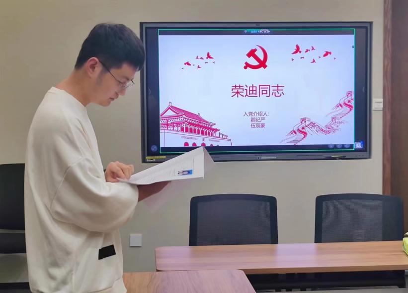 大会第一项是荣迪同志宣读入党志愿书以及介绍个人情况。荣迪,男,汉族,1998年8月2日出生于黑龙江省哈尔滨市,现就读于浙江大学机械工程学院制造技术及装备自动化研究所,于2021年6月递交了入党申请书。发言过后,与会党员代表对荣迪同志发表了意见,表示荣迪同志品行端正、成绩优秀、勤奋刻苦,入党态度积极端正,生活作风勤谨正派。