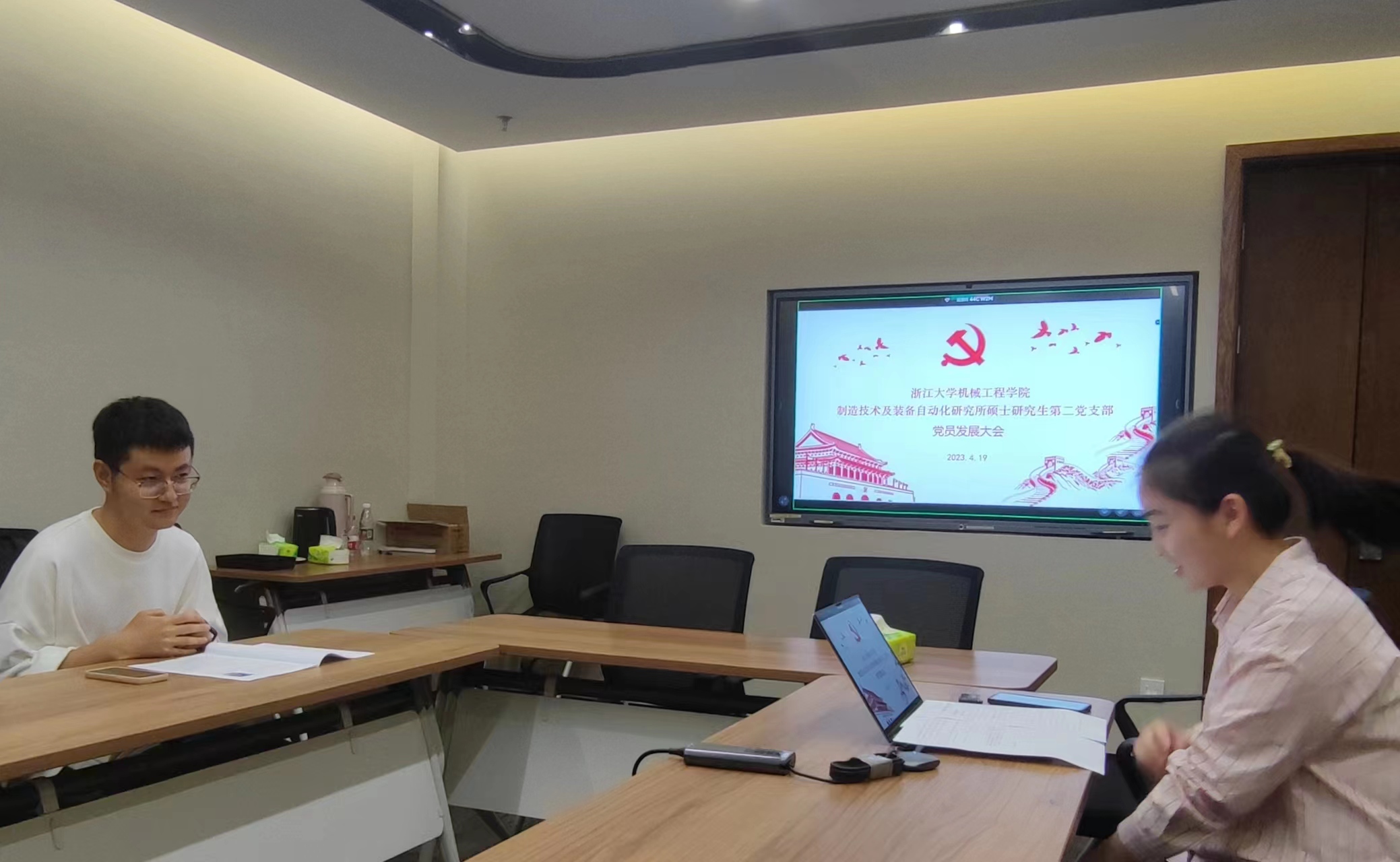 2023年4月19日晚,机械工程学院制造技术及装备自动化研究所硕士研究生第二党支部于开物苑1幢408会议室召开了党员发展大会,支部副书记叶楠主持本次会议。大会主要关于荣迪同志发展为预备党员相关事项。