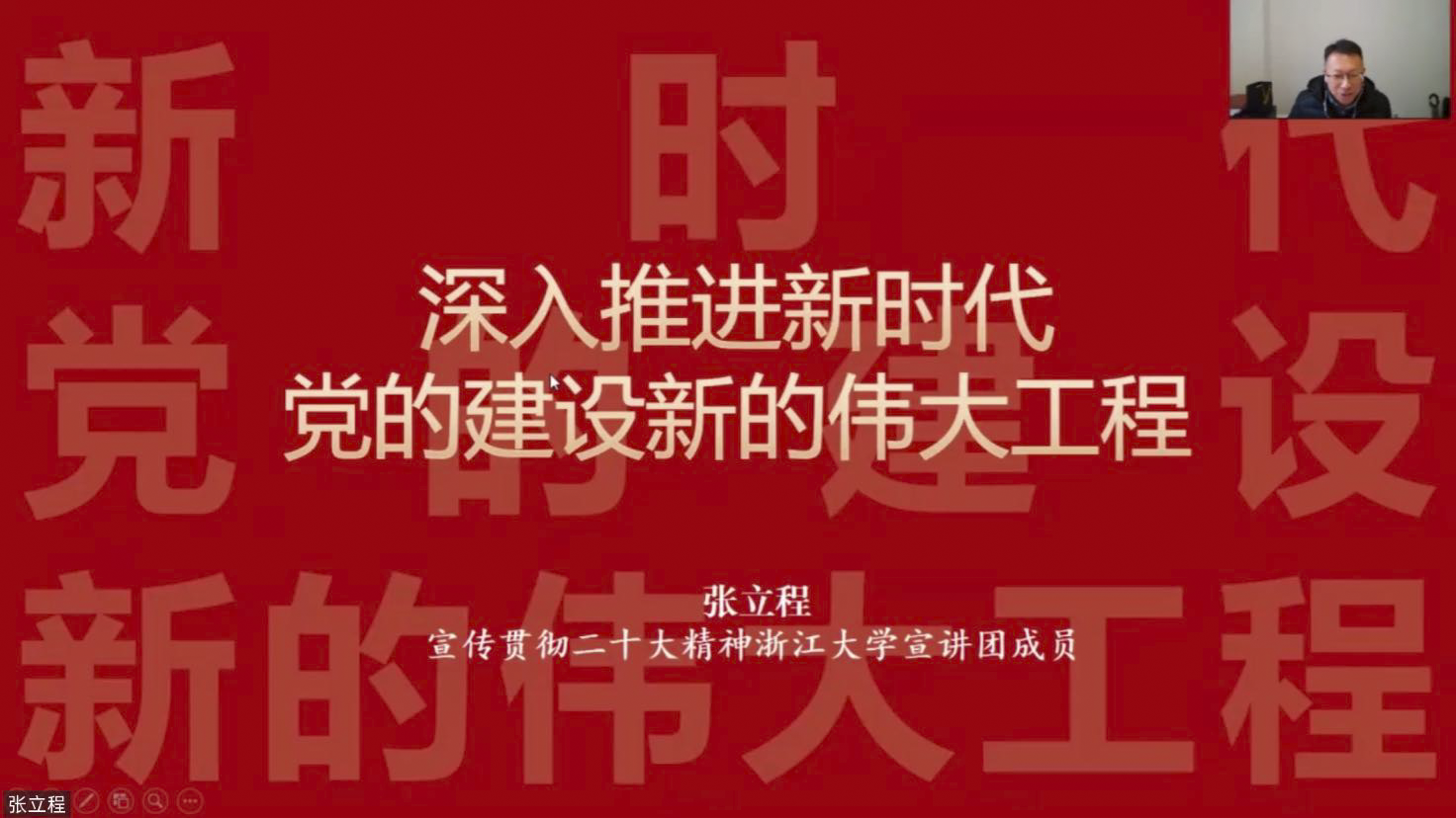 首先,张立程教授开展了主题为《深入推进新时代党的建设新的伟大工程》的宣讲。张老师从党史入题,指出中国共产党历来重视党的建设并勇于自我革新,展开讲解了新时代党的建设的基本内容和新时代全面从严治党的思路和举措。宣讲结尾,张老师更提醒新时代新征程背景下,青年要捍卫好意识形态阵地,做政治素质过硬时代新人。