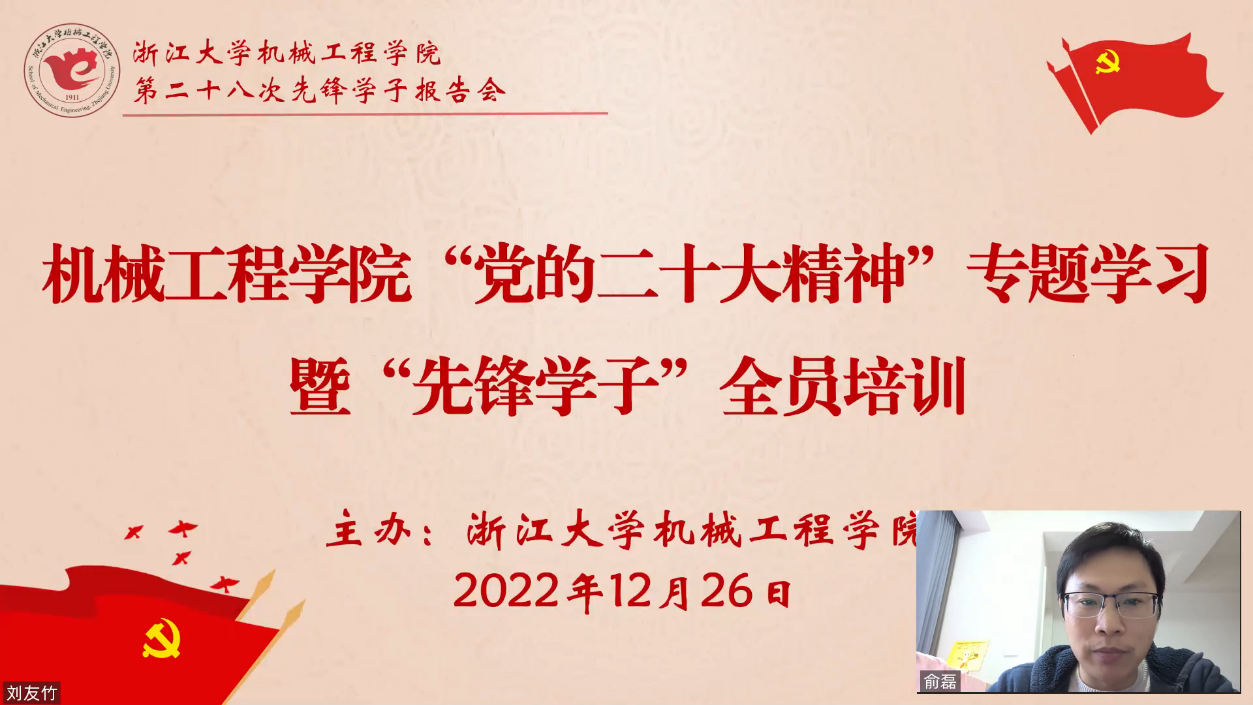 为认真学习、全面宣传、扎实贯彻党的二十大精神,深刻领悟“两个确立”的决定性意义,明晰新时代青年的使命担当,引领青年树立坚定理想信念和创新报国之志。2022年12月26日下午,机械工程学院以钉钉直播形式举办了党的二十大精神专题学习暨先锋学子全员培训第二十八次培训。机械工程学院全体师生党员通过直播收看了本次培训。