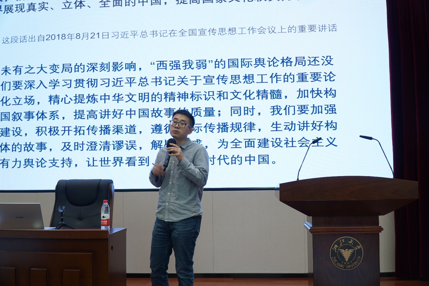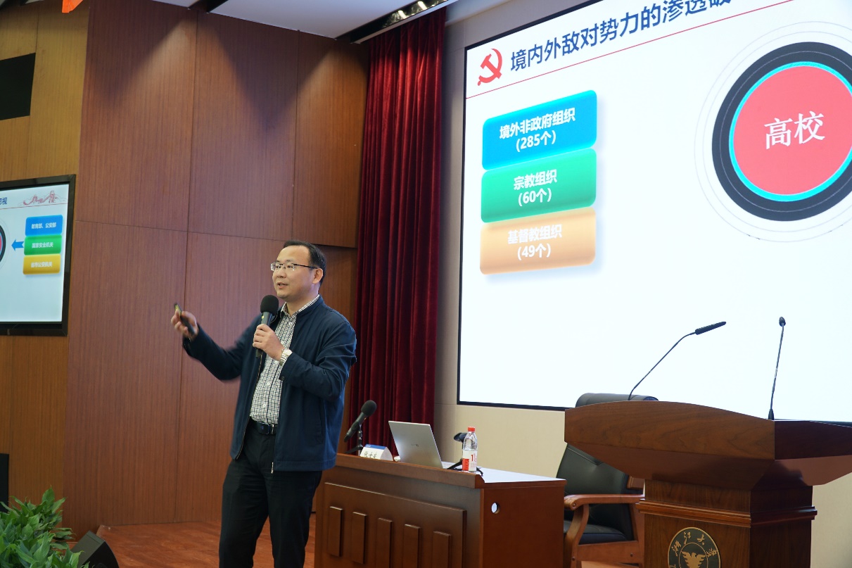 何毓新老师授课主题为《电影视角下的中国故事和中国声音》。何老师角度新颖,从电影的角度探讨特定年代下中国影视作品所表达的意识形态以及背后体现的中国发展历程。从两个特定的时间点出发,从中国共产党早期文化建设——20世纪30年代左翼电影文化运动到近年来中国电影故事,探讨中国以电影为代表的艺术作品如何在当今时代下提高国际传播能力,提高讲好中国故事的质量,为建设社会主义现代化国家提供有力的舆论支持,让世界看到听到新时代的中国。