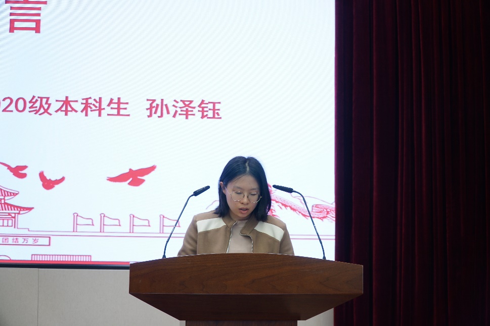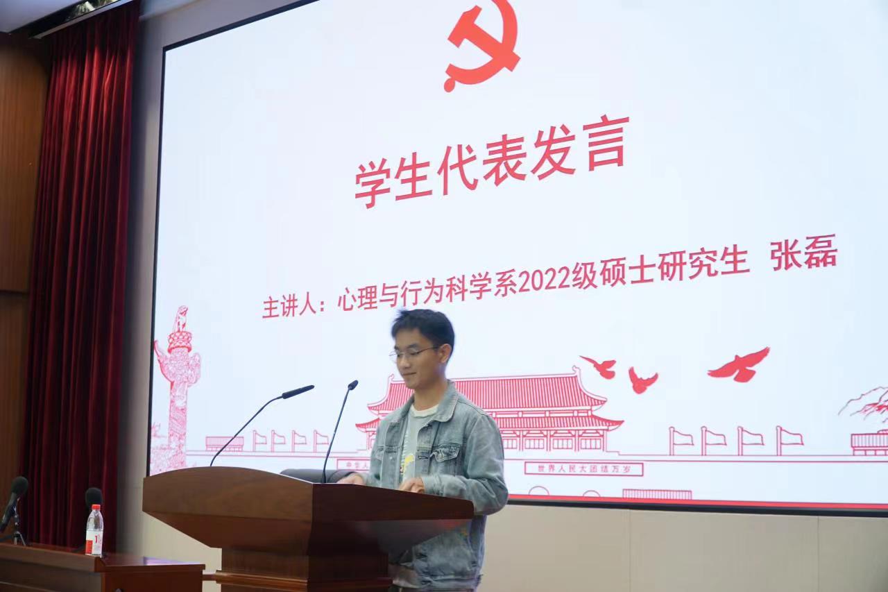 心理与行为科学系2022级硕士研究生张磊和高分子科学与工程学系2020级本科生孙泽钰作为学生代表发言,他们真挚诚恳地表达了自己的入党初心,并表示会努力学习党的基本方针路线,以正式党员的标准严格要求自己。