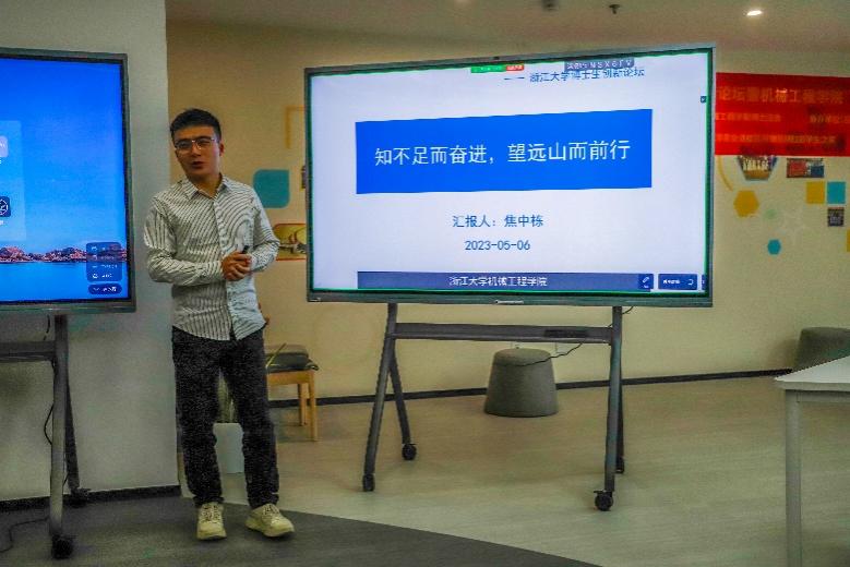 2023年5月6日晚,“共话科技前沿,闪耀青春力量” ——浙江大学第449期博士生创新论坛暨第一期“机械先锋”专题座谈会在浙江大学机械工程学院学生之家举行。本次活动邀请机械工程学院焦中栋、航空航天学院布热比·依明和能源工程学院李梓瑞三位竺奖获得者分享科研经验,共话学科交叉;同时邀请求是专利事务所副所长郑海峰分享专利申请相关内容。四位嘉宾结合自身经验进行了精彩的分享,并与现场同学热烈交流。