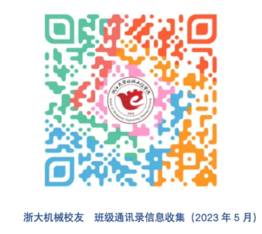 亲爱的校友:您好!共庆浙大机械成立112周年!请校友扫码填写通讯录(扫描下方二维码填写即可)。 联系人:张凯 浙江大学紫金港校区开物苑1幢-403室电话:0571-87951494。浙江大学机械工程学院发展联络办二零二三年五月十日