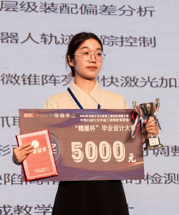 近日,2023年中国大学生机械工程创新创意大赛·中国机械行业卓越工程师教育联盟“精雕杯”毕业设计大赛在重庆大学成功举行。经过激烈的角逐,我院共有9个项目进入决赛,最终获得一等奖4项,其中金奖一项(个人项目全国第一)、银奖三项,二等奖2项,三等奖2项、佳作奖1项、最佳人气奖1项的好成绩!