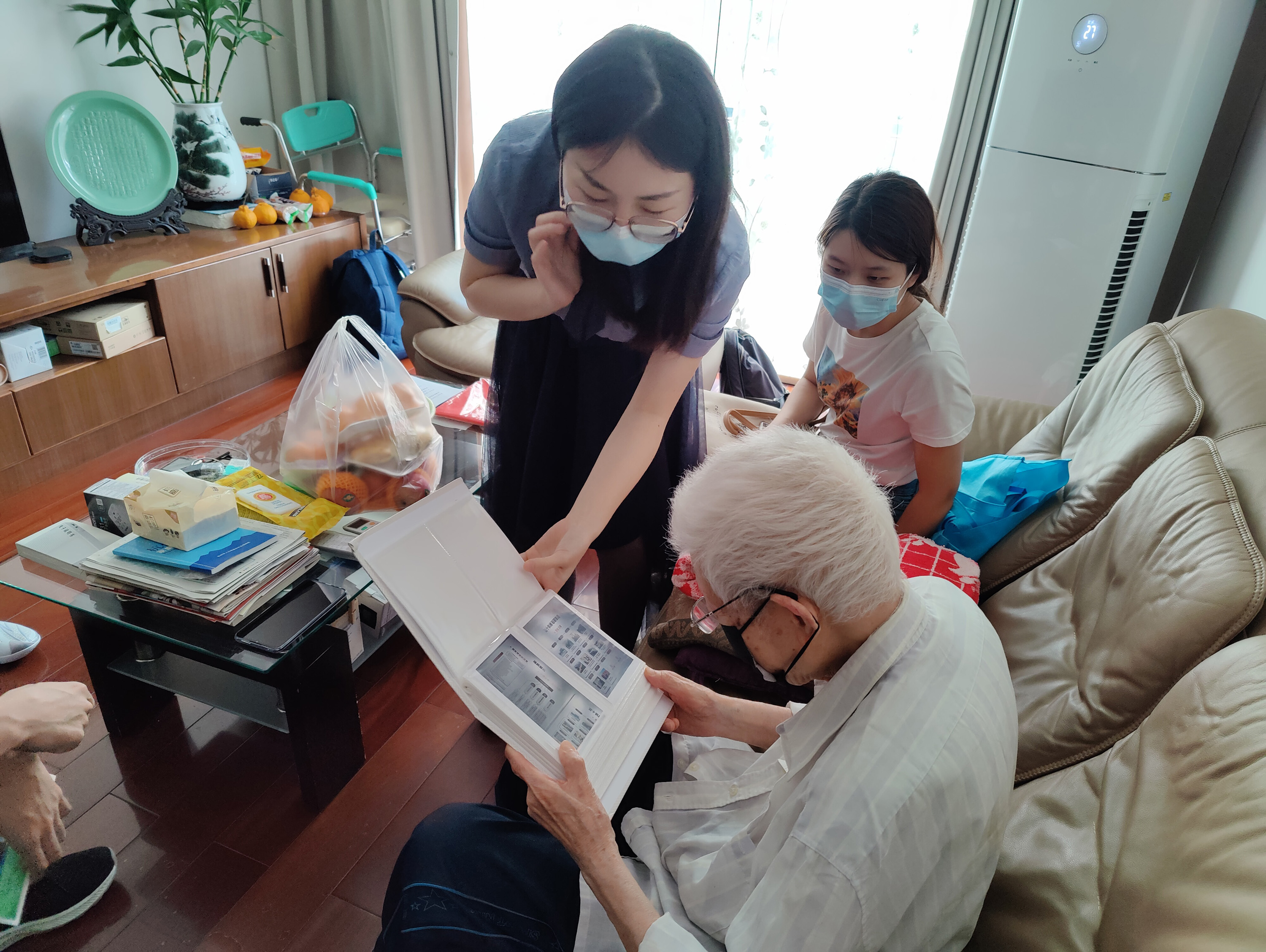 不一会儿,吴老师从房间走出,热情的与我们打了招呼。吴老师今年已经90多岁,虽步履略有蹒跚,但精神状态很不错,与我们进行交流时思维清晰,神采奕奕,好似还站着讲台上。时慧敏同志首先将精心准备的相册送到了吴老师的手中,相册里有很多支部成员以及机械工程学院新大楼的照片,吴老师对这个特殊的礼物很是喜欢,带上眼睛仔细的观看了起来。