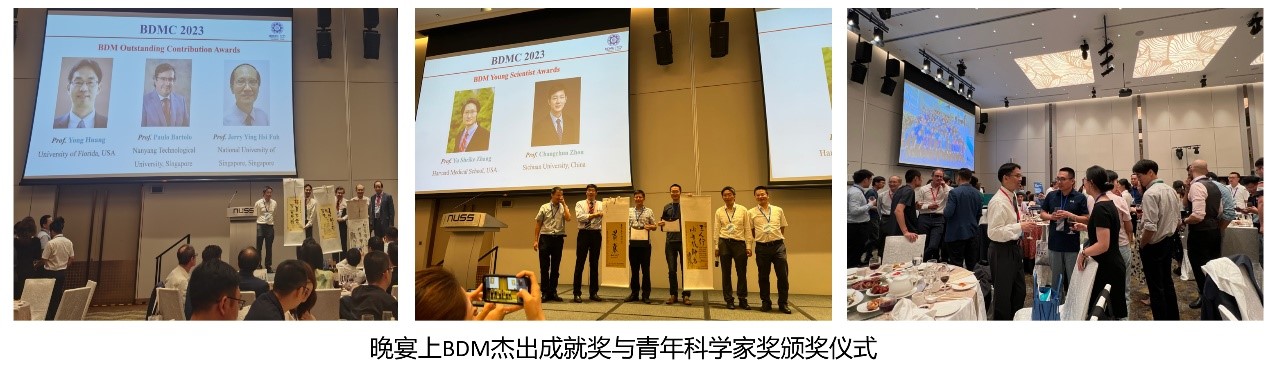 大会报告结束后,大家都轻松地步入晚宴斤,谁料想另一场学术文化盛宴在橘黄色灯光下拉开了帷幕。主持人马梁在大家举怀庆贺声中宣布本届大会将首次颁发的BDM杰出学术贡献奖与青年科学家奖,分别表彰为BDM期刊的发展做出杰出贡献的资深科学家与年轻科学工作者。今年获得BDM杰出贡献奖的获奖人分别为美国佛罗里达大学黄勇教授、新加坡国立大学Jerry Ying Hsi Fuh教授以及南洋理工大学Paulo Bartolo教授。杨华勇院士为三位颁发了奖状以及张月红主任亲自撰书的书法作品。青年科学家奖的获奖人分别来自美国哈佛大学的Y. Shrike Zhang教授与来自四川大学的周长春教授。崔占峰院士为两位获奖者颁奖。