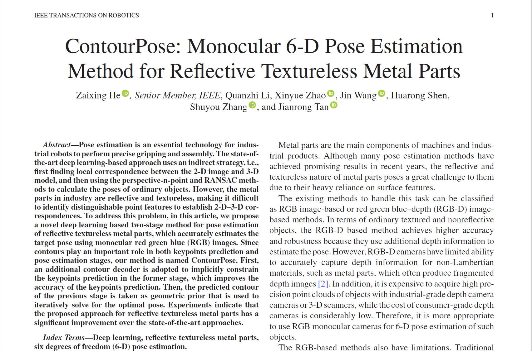 [1] Z He, Q Li, X Zhao, J Wang, H Shen, S Zhang, and J Tan. "ContourPose: Monocular 6D pose estimation method for reflective texture-less metal parts, " IEEE Transactions on Robotics, 2023, Early Access.