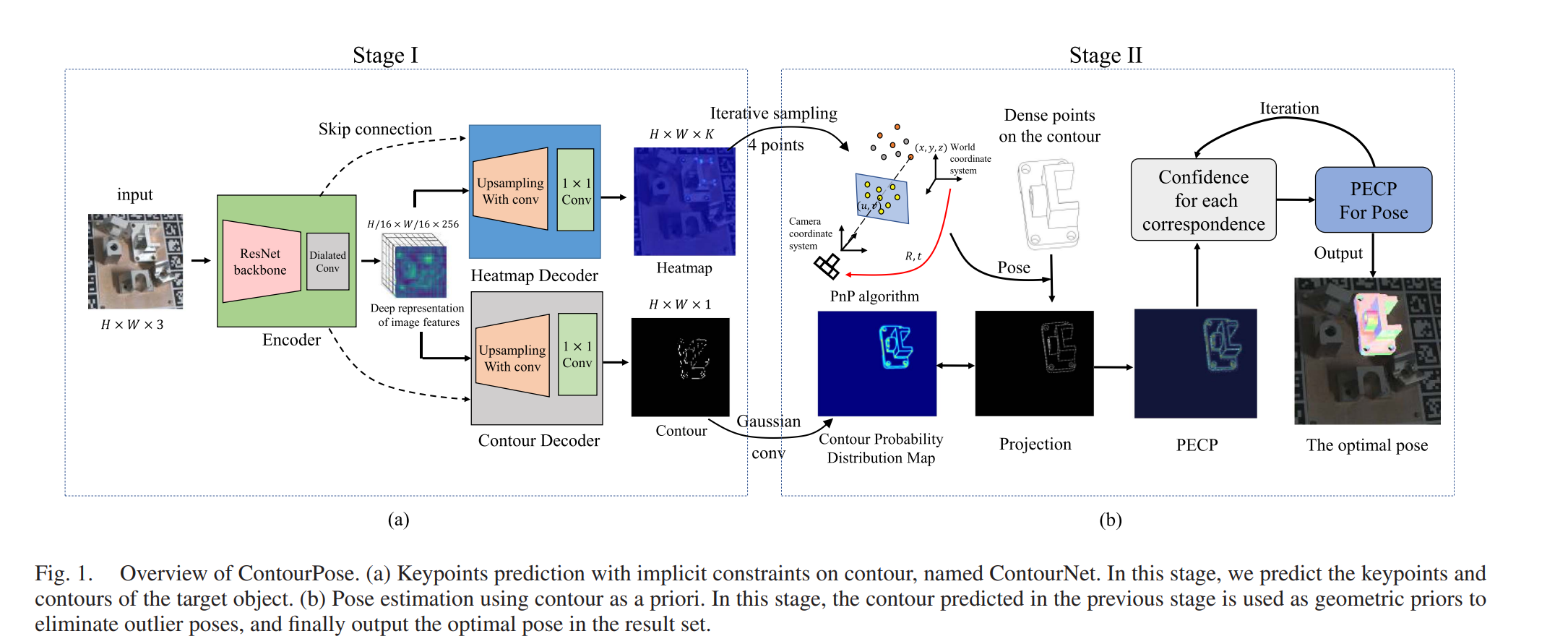 主要创新:利用点特征匹配结合深度神经网络来计算物体的6D位姿是通用领域的主流方法之一,然而在用于反光低纹理表面物体时,产生的主要问题就是关键点的不可靠,这对于位姿估计的结果影响是致命的。具体而言,会在两个关键环节产生严重的问题:(1)在图像中物体的关键点预测阶段,由于反光造成图像特征的改变,神经网络预测的关键点准确性比较低;(2)在6D位姿解算阶段,正确的关键点比例低,导致难以计算出正确的位姿、即使计算出来也难以判断位姿计算的结果是否正确。论文的主要思想是引入反光低纹理目标零件的可靠、鲁棒信息:轮廓。这一灵感来源于人类对物体的识别,往往只需要轮廓信息。而机械零件的轮廓正是在反光干扰下的唯一可靠信息。基于这一原理,作者设计了新的神经网络架构,在两个关键环节使用轮廓信息以提高位姿估计的准确性与精度(Fig. 1):(1)提出了一种轮廓约束的反光金属零件关键点检测深度学习框架:在关键点预测阶段,利用轮廓约束提高关键点预测的准确性。(2)提出了一种基于轮廓先验的位姿优化方法:在位姿估计阶段,将轮廓的重投影重合度作为位姿估计准确性的判断,从而可以在较低正确比例关键点的情况下,也能判断并获得准确的6D位姿。