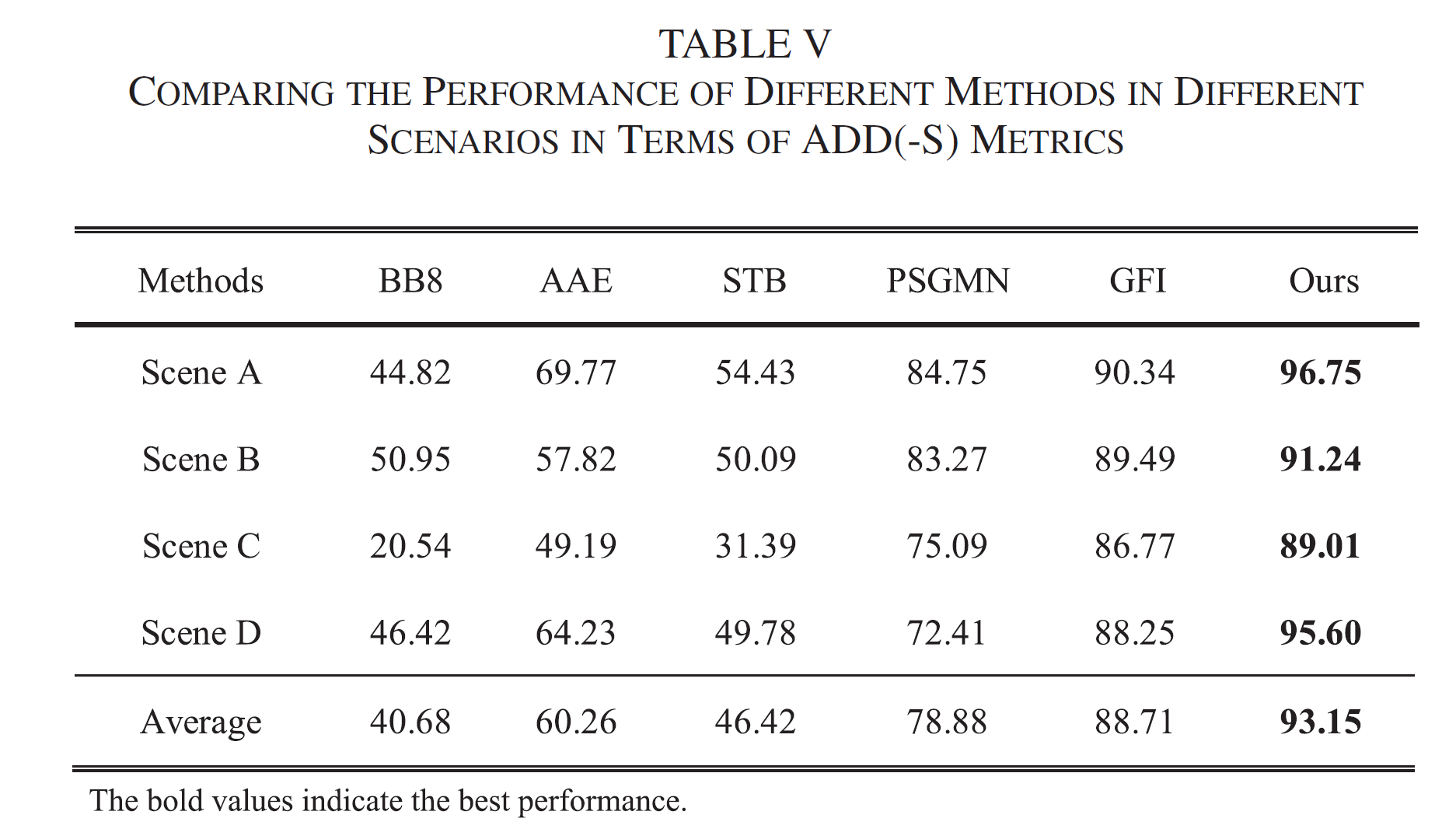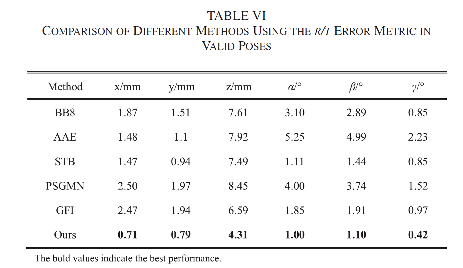 实验结果:以10个反光金属零件为对象构建了数据集,包含4个不同场景,从位姿估计成功率(误差小于零件尺寸10%视为成功)和位姿估计精度两方面对本文方法和现有主流方法BB8、AAE、STB、PSGMN、GFI等进行了对比,实验结果(Table V、VI)表明本文方法不论是成功率和精度都大幅优于现有方法。本方法可以有效引导工业机器人在复杂场景下对目标零件进行抓取等智能自主操作(Fig. 16)。