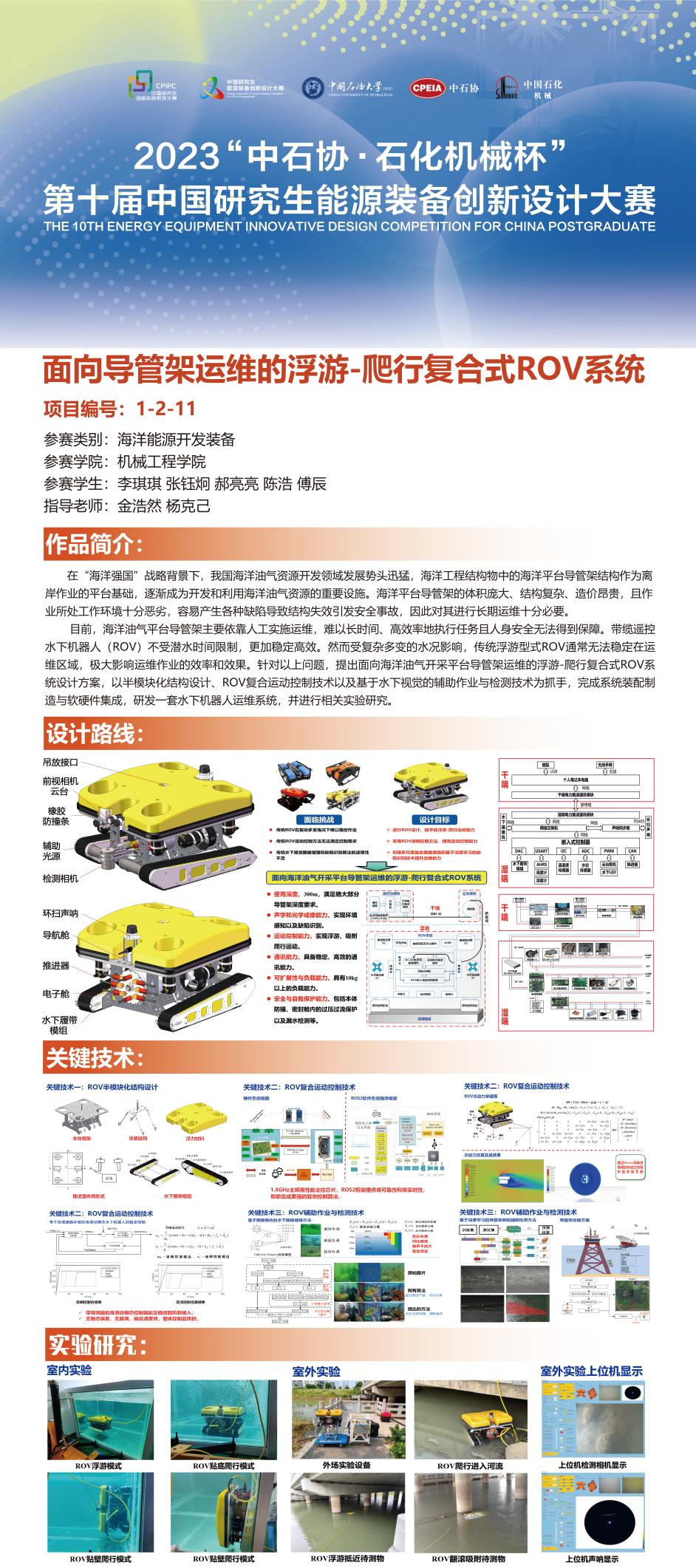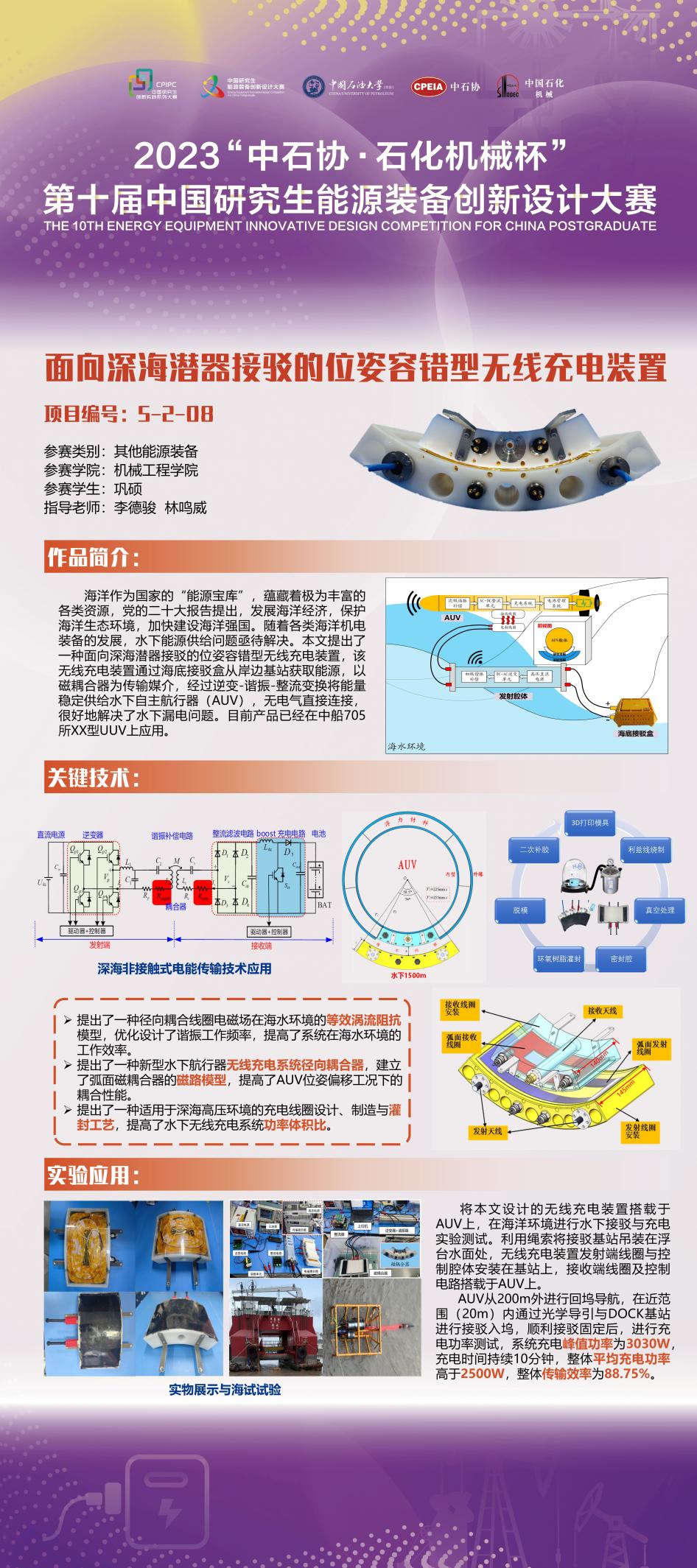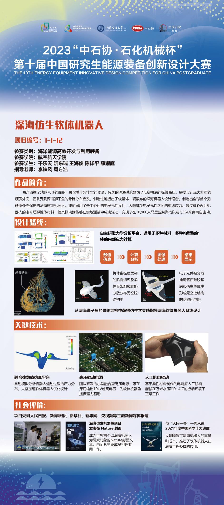 参赛作品经展板(实物)展示及现场答辩评审及“能源装备之星”交流展示等环节,最终“深海仿生软体机器人”团队获得全国一等奖;“基于多级相变储热的高寒地区太阳能与热泵联合供热系统”团队获得全国二等奖;“鱼雷型八推进器高机动性水下机器人”团队、“深蓝之眼--甲烷渗漏区移动式多功能探测平台”团队、“面向导管架运维的浮游-爬行复合式ROV系统”团队、“面向深海潜器接驳的位姿容错型无线充电装置”团队、“基于新能源材料的废水处理设备”团队获得全国三等奖。