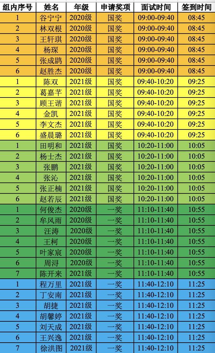 经过前期申报,资格复查,现通知2022-2023学年国家奖学金及浙江大学一等奖学金面试安排如下: