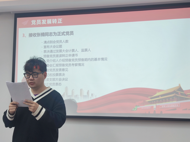 首先,会议通过了转正计票人和监票人,讨论郑可乐、季增琛、张楠同志的转正问题。郑可乐、季增琛、张楠同志宣读了转正申请书,讲述了预备期间的感悟,分析了自己存在的不足,提出了未来的努力方向,部分党员对他们的转正发表了自己的意见,群调负责人根据群调结果列举了他们各自的优缺点,提出了肯定与批评,与会正式党员投票后全票通过同意转为正式党员。