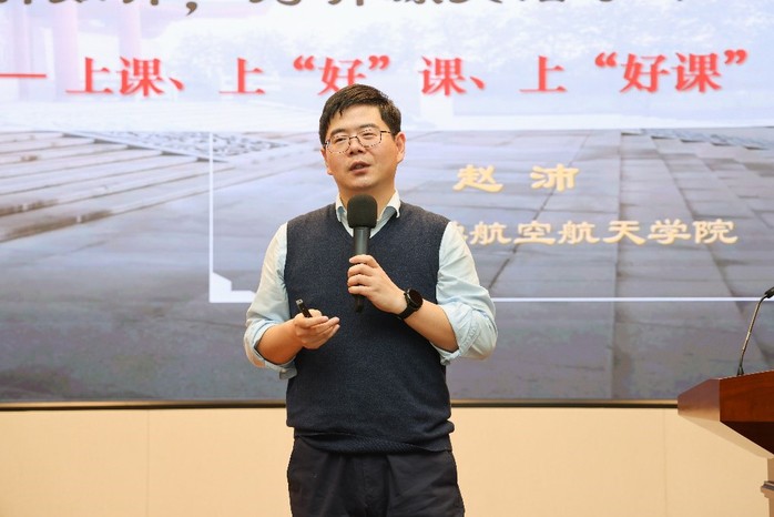 活动特邀了航空航天学院的赵沛教授为全体青年教师们作教学经验交流分享及教学示范。赵老师是浙江大学求是教学岗教授,目前担任航空航天学院院长助理、工程力学专业执行负责人、应用力学研究所副所长,曾获宝钢优秀教师、浙江省高校青年教师教学竞赛一等奖等,在教学研究上有深刻的见解和认知。首先,他从自身教育实践经验和教学改革经历出发,以“上课、上‘好‘课、上‘好课’”为中心与大家分享教育教学的经验与感悟。他指出课程设计需要严谨的逻辑思维,以解决实际教学问题为导向改变教学模式,坚持守正创新,通过留住学生、引导学生、启发学生发挥高等教育的价值。随后,他以力学通识课程为例,做了如何上好课,上“好课”的现场教学示范。
