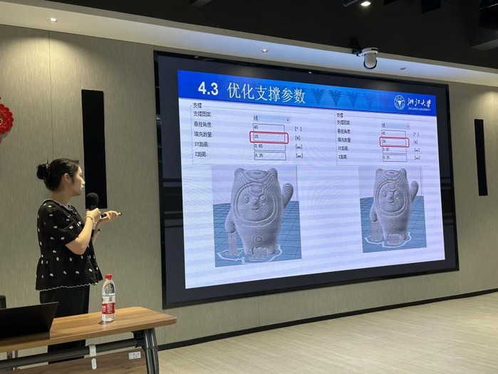 机械工程学院工程训练中心栾丛丛、周宵两位中心任课老师进行了3D打印教学展示。