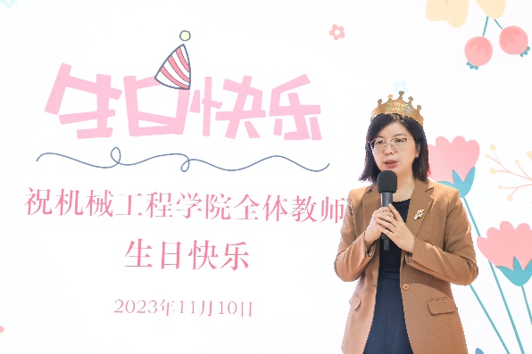 项淑芳老师代表学院为各位寿星老师献上祝福,祝大家身体康健,生日快乐。项老师表示机械学院是一个大家庭,学院与学科的进步离不开每一位老师的努力和贡献,她为学院的各位老师而骄傲,希望本次集体生日会的举办能为大家提供一个放松身心、互相交流的分享平台,在繁忙的工作之余感受到学院大家庭的温暖。俞磊老师首先围绕学院工会建设情况向各位寿星老师做简要介绍,俞老师感谢各位老师对学院与工会工作的支持,学院今后会进一步推动文化建设与人文关怀,展现我院全体教职工最积极的精神风貌。