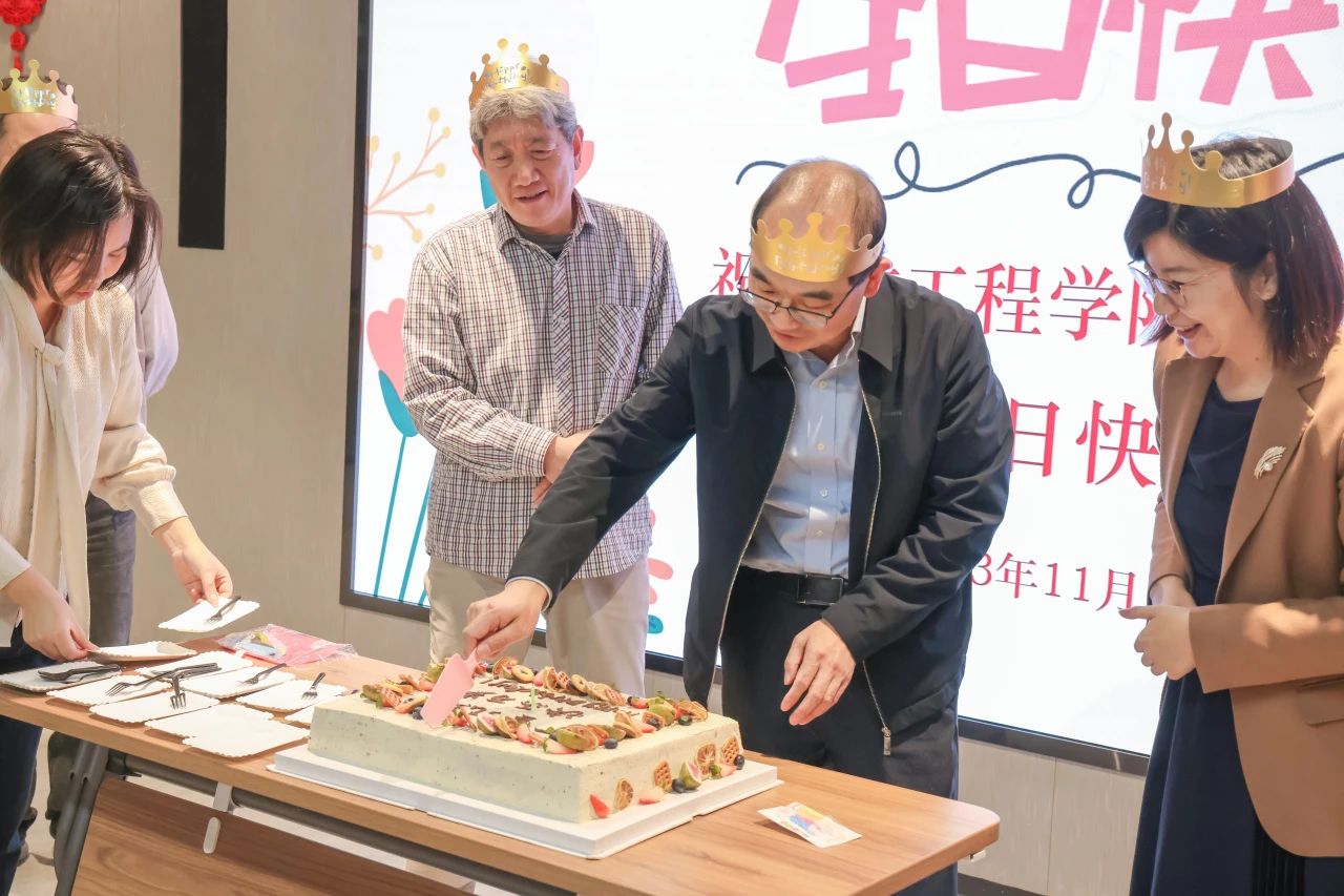 各位寿星老师共进午餐后,伴随着《生日快乐》动听的歌曲,项淑芳老师、刘振宇老师代表学院为各位寿星送上工会精心准备的生日礼物,由寿星代表杨灿军老师、巨阳老师一起点燃生日蜡烛,许下美好心愿,并为各位老师分发美味的生日蛋糕。