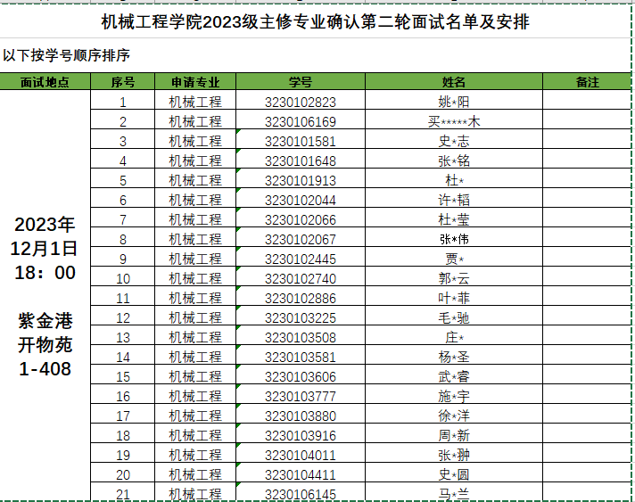 根据《浙江大学本科生主修专业确认办法》(浙大发本〔2016〕109号)文件,本科生院《关于2023级本科生主修专业确认工作的通知》,以及《2023级机械工程学院主修专业确认工作细则》,经学生申请,机械工程学院主修专业确认工作小组根据全部申报学生信息材料进行认真审核,确定面试名单见附件。面试安排如下:
