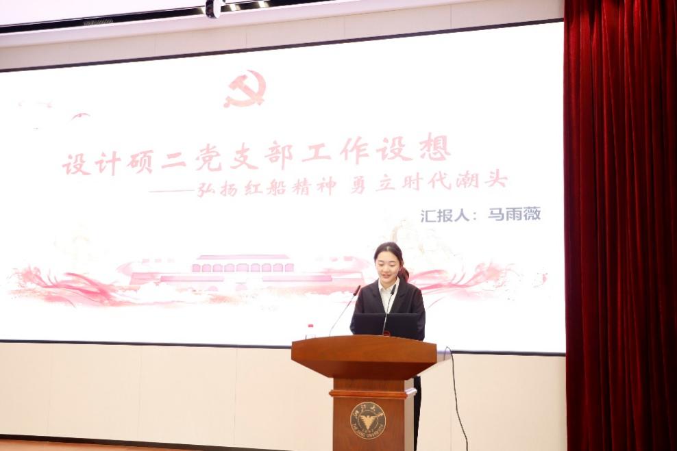 来自设计工程研究所硕士研究生第二党支部的马雨薇同志以“弘扬红船精神, 勇立时代潮头”为主题,向大家展示了她对未来党组织生活的规划。通过阅读书记、观看纪录片、嘉兴南湖实地考察等方式,从党的诞生之地,沿着党的成长轨迹,继承和弘扬“红船精神”,鼓舞支部党员坚持不畏艰险、艰苦奋斗的精神,坚定共产主义理想和中国特色社会主义信念。