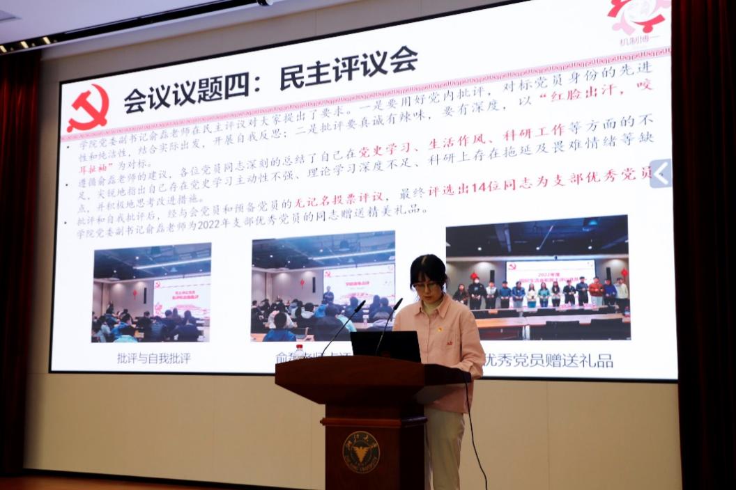 制造技术及装备自动化研究所博士研究生第一党支部书记吕晨昕向大家展示了“科研创新驱动发展,凝聚力量共创未来”主题组织生活会。以“身边的学术榜样”坚定支部党员为国家科研努力奉献的决心,在每一天的科研生活中补足精神之钙、砥砺初心使命、展现担当作为。同时,她率领支部积极查摆问题,进行了深刻的批评与自我批评,不断提升党员觉悟、促进党员进步。