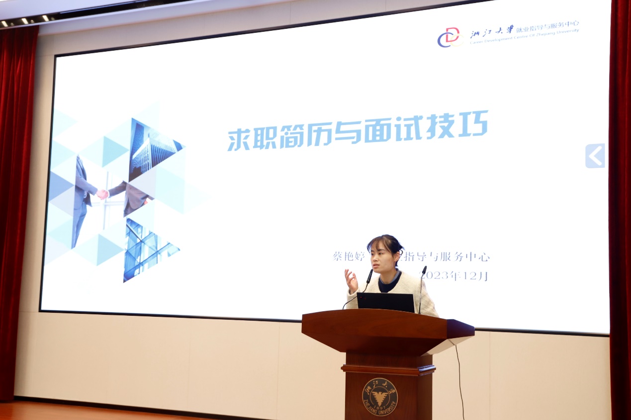 2023年12月8日下午,机械工程学院邀请浙江大学就业指导与服务中心就业指导部老师蔡艳婷为2025届毕业生做了就业素能培训,对即将开展的求职就业进行培训指导。蔡艳婷从职业目标、面试细节、简历分析、常见问题四个方面对对即将毕业的学生们进行了全面的就业指导,使毕业生对于就业流程和其中的关键节点有了更加全面的把握。