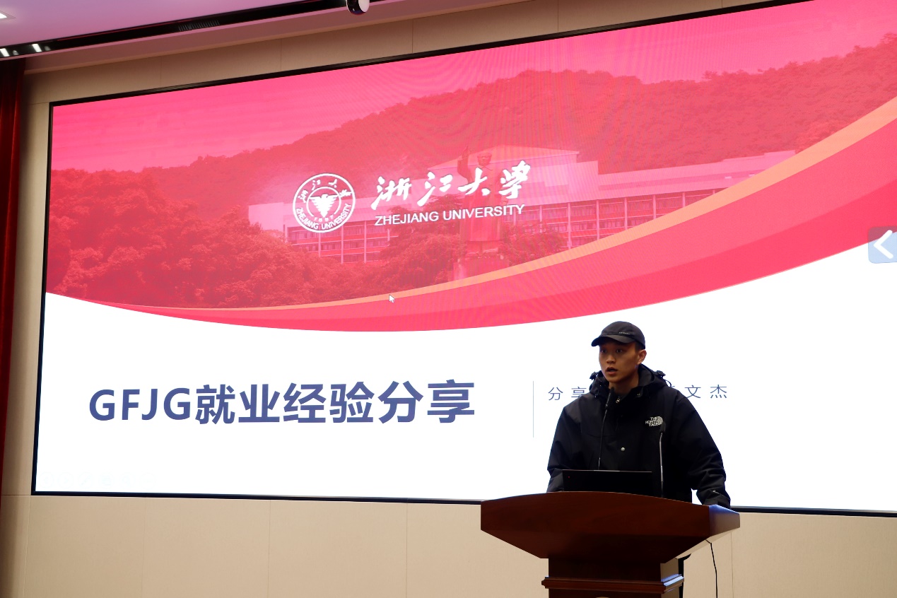 在毕业生分享环节中,2023届毕业生丁斌杰向同学们分享了选调生的备考和工作经验,分别介绍了国考、浙江省考和浙江选调的考试流程以及选调生的报考条件。结合自己的备考经验,讲述了笔试和面试的备考技巧。