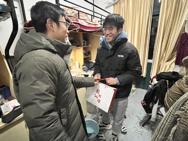 12月20日晚,党委副书记俞磊老师、团委书记金娟霞老师、团委副书记陈宇烽老师前往学生宿舍看望慰问考研学生,并送上考研大礼包。120余份大礼包带着全院老师的关心和祝福,送到了每一位考研学子的手中。精心设计的学院考研助力纸袋,写着“前程似锦,一‘研’为定”,里面装有考研必备文具、巧克力、牛奶、暖宝宝、纸巾等物品,意在为同学们提供力所能及的保障,祝福考研学子们取得佳绩。