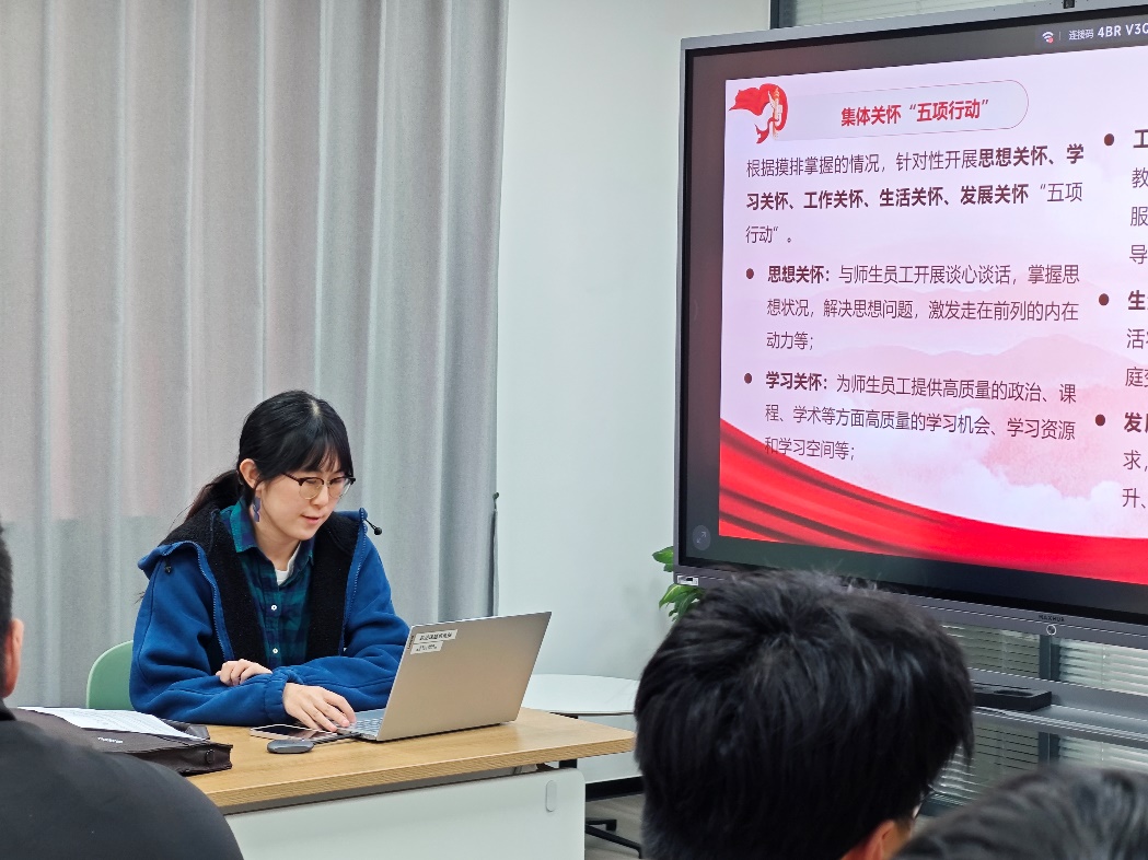 活动第一项,党支部书记吕晨昕同志开展了“岗位建功,党支部集体关怀”的主题讲解。为深化学习贯彻习近平新时代中国特色社会主义思想主题教育成效,深入贯彻落实全国组织工作会议精神,落实学校第十五次党代会决策部署,把基层党支部建设成为推动学校在建设中国特色世界一流大学中“走在前列”的坚强战斗堡垒,决定开展基层党支部建设质量提升月活动。强化岗位建功,深化集体关怀,增强基层党支部保障一流的战斗力和凝聚力。吕晨昕同志提到我们学生党支部突出坚守理想信念、引领优良学风、立志成长成才、服务强国战略,可以线上线下相结合,进行岗位公示、职责上网上墙等,有条件的可以在实验室、工作区域、研学空间、服务窗口等处设置明显标识。此外,学生党支部侧重学业、就业等方面存在困难的学生,摸排掌握本单位党内外全体师生员工的困难情况。全覆盖摸排本单位师生员工在思想、学习、工作、生活、发展方面存在困难的数量和困难情况等。根据摸排掌握的情况,针对性开展思想关怀、学习关怀、工作关怀、生活关怀、发展关怀“五项行动”。