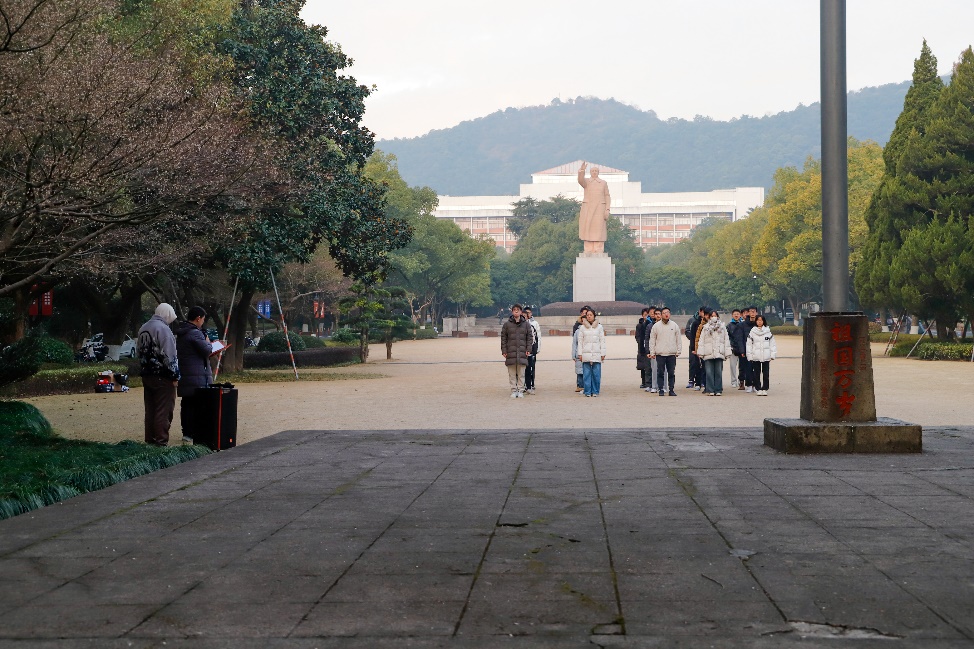 早上6点50,师生们在国旗杆前的大草坪集合完毕,寒风凛冽,却吹不灭青年们内心的热情,大家翘首等待国旗出现。