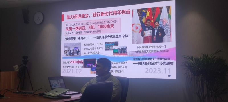 戚博特博士从自身专业出发,讲述了作为一个体育人在浙大追梦圆梦的故事,告诉同学们要“静的下心,吃的了苦,坐的住冷板凳”。作为本届亚运会火炬手,同时也是浙江大学亚运志愿服务专项工作成员,戚博士分享了他投身志愿实践7年来的收获与感悟,告诉同学们要在前进的过程中不断摸索适合自己的发展道路,去发现自己人生的无限可能。