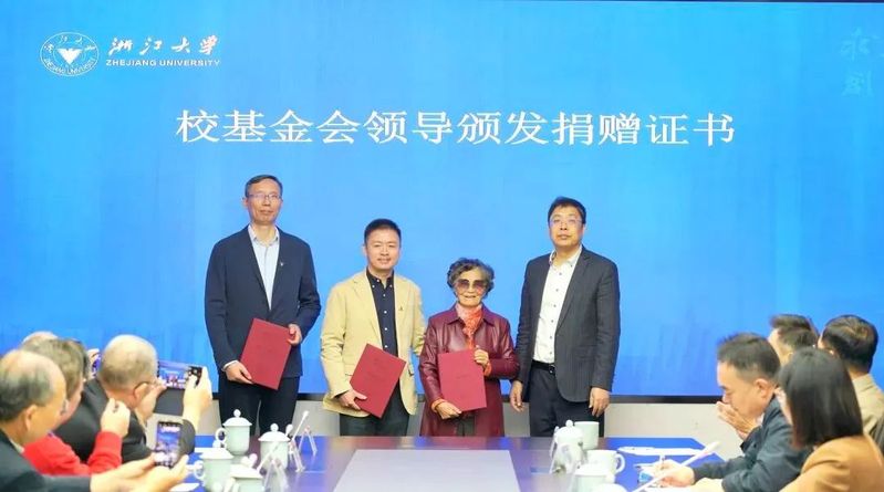 丁海忠代表浙江大学教育基金会向张光琼教授,沈波、章国巨两位校友颁发捐赠证书,向张光琼教授和章国巨校友颁发铭牌。