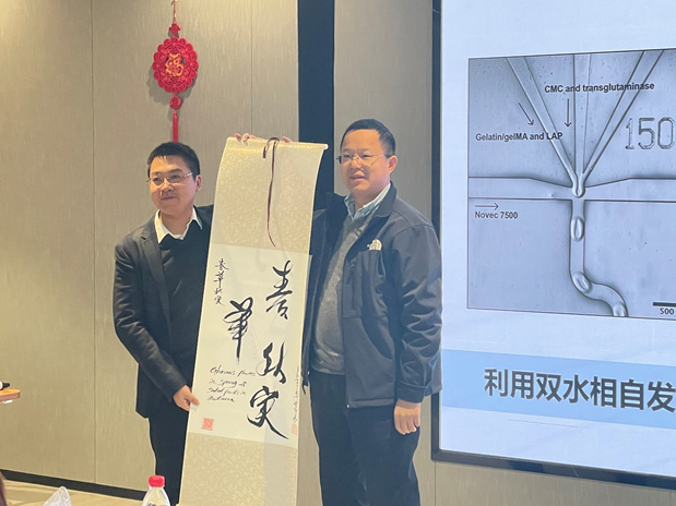 下午的论坛下午的论坛由机械学院尹俊研究员和周竑钊副研究员主持。哈尔滨工业大学的吴春亚教授以《仿生疏液表面制备技术及其润湿性能调控研究》为题,介绍了微纳复合结构表面的稳定制备工艺、性能表征和功能开发,重点揭示影响表面润湿功能的内在机制的研究进展。吉林大学的牛士超教授在报告《仿生功能表面模板微纳制造技术》中,介绍了一种简洁高效的仿生功能表面模板微纳制造技术,采用此技术机械产品表面可以高精度继承生物表面微纳尺度精细结构及其对应的独特功能的研究。中国科学院杭州医学研究所的刘远教授以《纳米蛋白组学与癌症诊断》为题,介绍了一种通过纳米材料富集血液中低丰度蛋白,建立癌症蛋白组学数据库,利用机器学习筛选新的蛋白标志物技术。浙江大学附属邵逸夫医院的王一帆教授以《人源诱导型肝样细胞防治大范围肝切除术后肝功能衰竭的研究》为题,介绍了将 hiHep BAL 应用于大范围肝切除术后肝功能衰竭的治疗上的研究。四川大学的陈俊宇副教授在报告《针对微循环系统的组织透明化成像技术的构建及其在组织调控方面的应用探究》中,介绍了研究血管和淋巴血管功能性调控软硬组织的相关机制的研究。布里斯托大学的James Armstrong教授以《Controlling the Assembly of Biomaterials Engineered Tissues》为题,介绍了一种可控生物材料三维生物打印方法,和利用超声驻波将活细胞工程化为各向异性组织,以及利用超声波触发分子过程设计模块化系统的研究。
