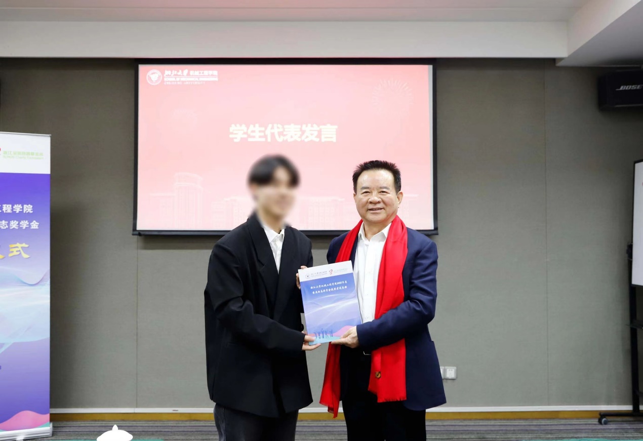 陈子辰书记首先对获奖同学表示祝贺,并对倪良正董事长、郑明治会长多年来的关心、支持表达了由衷的感谢。他希望同学们要学习倪良正董事长开拓进取的精神和大爱无疆的精神,并嘱咐他们牢记浙大校训“求是创新”,自强不息,争做堪当大任的时代新人。随后,陈子辰送上了由机械学院和良正爱心社的师生们准备的郑明治会长人像手绘,感谢圣奥集团和圣奥慈善基金会长期以来对浙大机械学子的关心与支持。