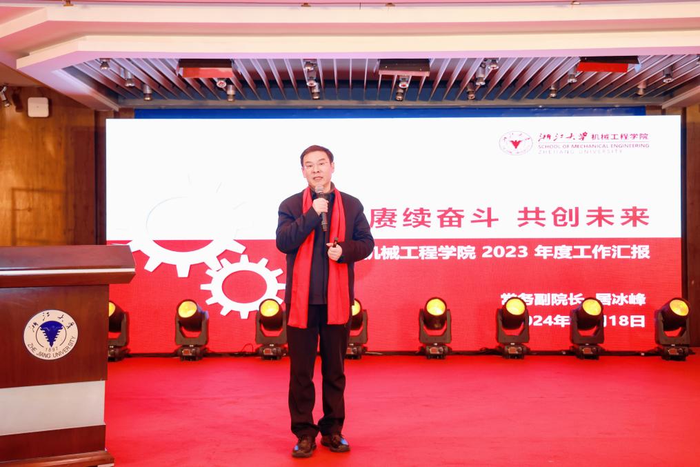 学院常务副院长居冰峰代表学院做2023年度工作汇报。居院长从学院重要荣誉、学院重大事记、党建思政建设、学科建设进展、国际化与联络、重要媒体报道等六个方面介绍学院取得的重要成绩,同时感谢学院各位教师过去一年做出的贡献,并祝愿在未来的2024年,国家日益繁荣昌盛,浙大发展蒸蒸日上,机械学院赓续辉煌。祝学院全体教师身体健康,阖家欢乐,新春大吉。