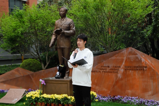 机械工程学院2022级本科生郭林瀚在林俊德院士雕像前深切缅怀了浙大先辈们。他谈到,林俊德院士“择一事,终一生”的人生抉择给予他诸多思考与启发,让他从彷徨中汲取到前进的力量。值此缅怀之际,他向诸位师生发出倡议:发扬先辈之精神、肩负时代之重托,努力践行“舍小我,为大国”的新时代青春誓言。