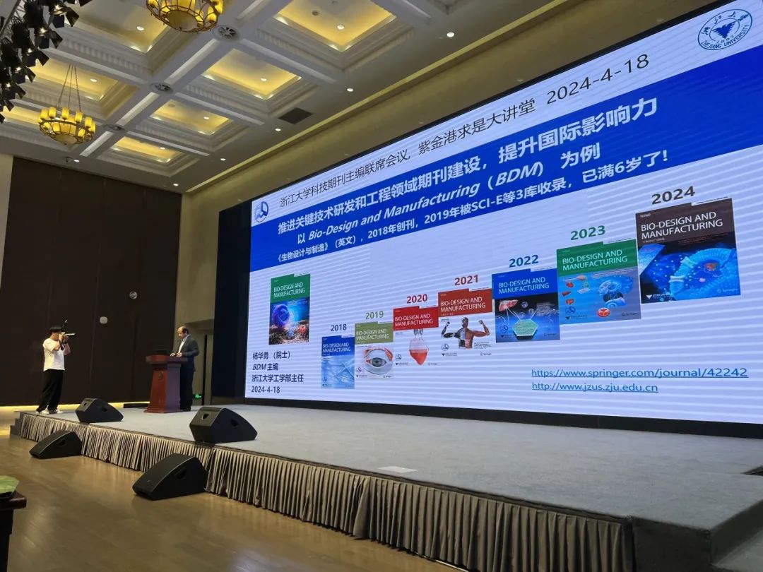 会议首先聆听了杨卫院士关于《我国STEM发表及期刊的发展地貌图》的主旨报告;继之由浙江大学出版社褚超孚社长介绍了浙江大学期刊建设情况;接着浙江大学工学部主任、机械工程学院教授杨华勇院士作为浙江大学所办期刊的主编代表作题为《推进关键技术研发和工程领域期刊建设,提升国际影响力--以Bio-Design and Manufacturing(BDM)为例》的主题报告。