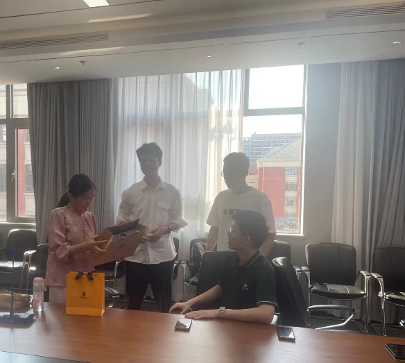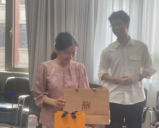 交流结束后,支部成员也为胡老师送上了精心准备的礼物。硕二支部送上了一条丝带,既呼应了今天的“银丝带”主题,也表达了支部成员们对胡老师参加本次会谈活动的感激之情。硕一支部给胡老师送上了带有开物苑不同场景照片的24年台历作为纪念,让胡老师对搬至新校区的机械学院新址有所熟知。