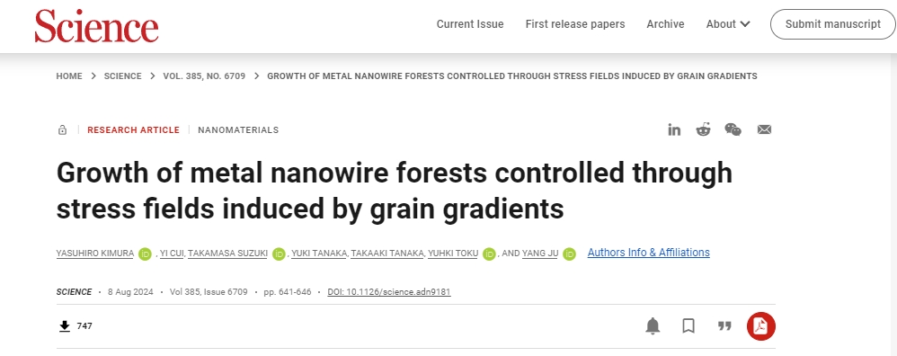 2024年8月8日,浙江大学机械工程学院巨阳教授、名古屋大学微纳机械理工学系Yasuhiro Kimura博士团队合作在Science期刊发表题为“Growth of metal nanowire forests controlled through stress fields induced by grain gradients”的研究论文,Yasuhiro Kimura博士、巨阳教授为论文共同通讯作者。