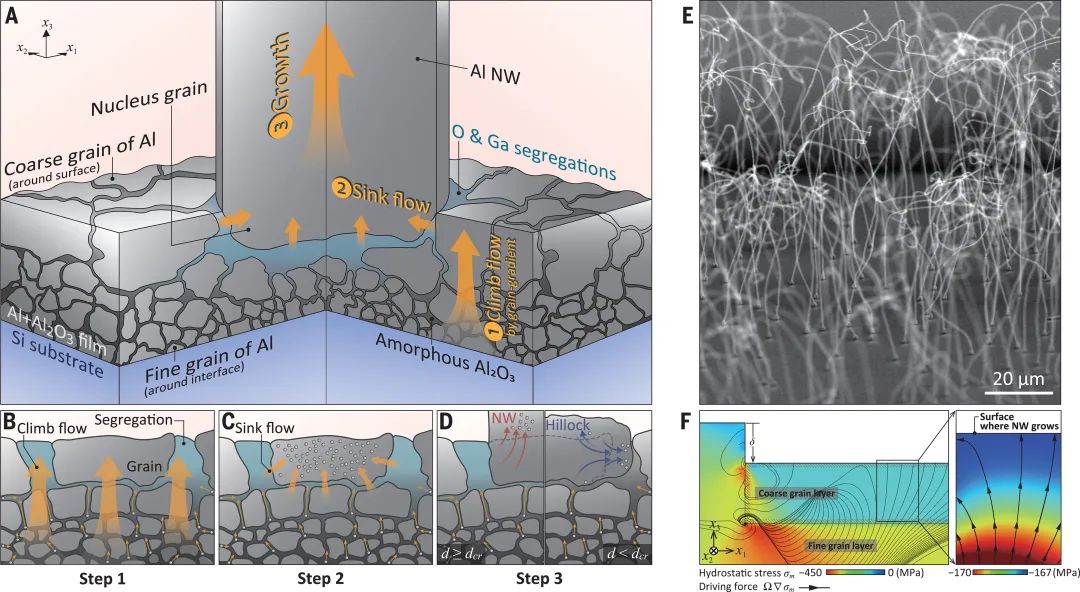 1.本质上,如果晶粒尺寸d大于临界晶粒尺寸dcr,超过这个尺寸时BHT(黑斑组织)占主导地位,那么积累的原子可以在不对应NH(纳米孔洞)蠕变的面内应力松弛的情况下进行NW生长。根据等式3的计算,得到的dcr为33纳米几乎与实验观察到的FIB诱导的粗晶粒尺寸相同(图3B和C)。获得的特定d值在NW生长中起着重要作用,因此应该加以控制。值得注意的是,如果给予的偏析不足(这允许晶界移动导致各向同性应力松弛),则会导致种子晶粒对各向异性NW生长的作用丧失,因此小丘各向同性地形成。本文得出结论,具有足够大尺寸且有杂质偏析的晶粒充当NW生长的核心。因此,来自Al2O3的O杂质和来自Ga+束照射的Ga杂质对于NW生长是必需的。上述观察结果如图4所示进行了总结。Al NW森林生长的综合现象可以通过原子扩散依赖于晶粒的弹性极限的理论来解释。