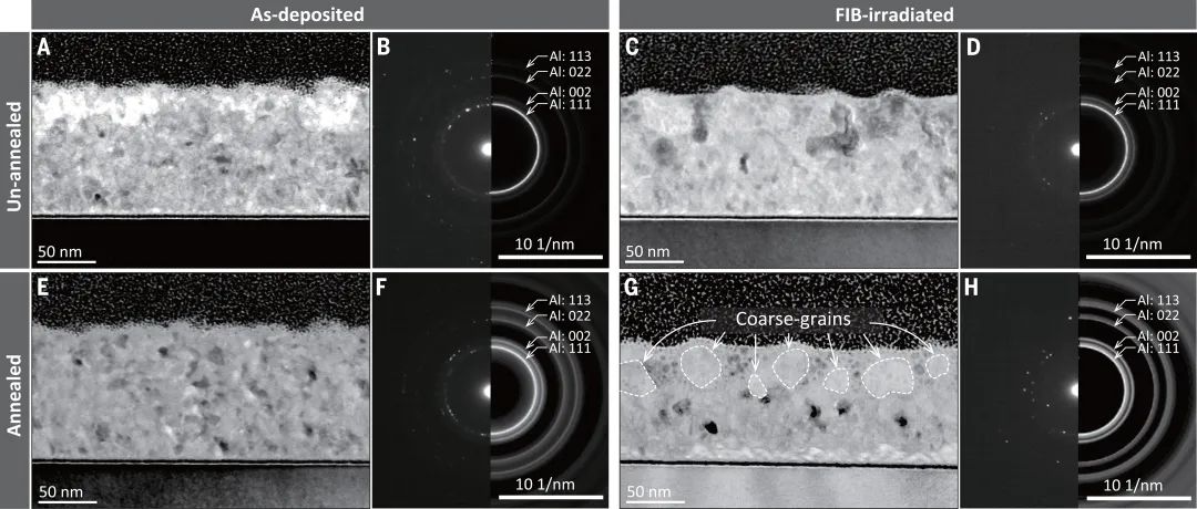 1.本文探究了为什么轻微的聚焦离子束(FIB)照射有助于纳米线(NW)生长。本文进行了晶体学分析,专注于通过扫描透射电子显微镜(STEM)的晶粒分布。图2显示了基于FIB照射、炉子退火或两者结合的薄膜截面的四个STEM-低角度暗场(LAADF)图像。FIB照射的主要影响是在晶粒分布上,在退火前后晶体状态没有可观察的变化,也没有观察到由FIB照射或炉子退火引起的晶粒中的位错和取向变化。由FIB照射引起的最显著的变化是表面附近的局部晶粒粗化(类似于晶粒生长)。FIB诱导的晶粒粗化是众所周知的,Park等人报告说FIB表面照射导致NiFe和FeCoN中的晶粒生长。