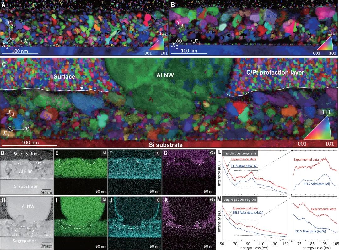2.接下来,使用了电子背散射衍射(EBSD)来揭示FIB诱导的晶粒粗化对Al NW生长的影响,并获得更定量的晶粒分布。然而,正如图2所示,本研究中使用的薄膜具有小于几十纳米的超细晶粒,使用普通SEM-EBSD很难获得数据。为获得这种定量的晶粒分布,本文对对应于图2中E和G的退火薄膜的非照射区域(图3A)/FIB照射区域(图3B)进行了更高分辨率的自动晶体取向映射(ACOM)-STEM-EBSD。NW基部的周围区域也被ACOM-STEM-EBSD捕获,如图3C所示。请注意,EBSD的反极图(IPF)结果是为了图3C而定向到与基底垂直的方向的x3(以下定义为x1、x2和x3方向,如图3中的坐标所示)。进行了STEM-LAADF图像(图3D和H)、STEM-EDS(图3E至G和I至K)和STEM-电子能量损失谱(EELS)(图3L和M)分析以进行更深入的晶体成分分析。
