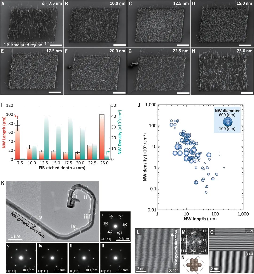 2.FIB蚀刻深度被优化以获得森林的最大NW密度,注意到NW密度和长度之间存在权衡。这种平衡是体积守恒的结果,如图1J中的图表所示,其中包括所有NW森林生长的结果。最高的NW密度达到了180×105/cm2,或对于宽度为190纳米的NW的表面覆盖率为0.51%;最长的NW长度为210微米。大多数NW的直径(对应于气泡的大小)在100到300纳米之间。过度和不足的δ,对应于过度和照射不足,减少了NW密度。这些结果在补充文本中有进一步描述。