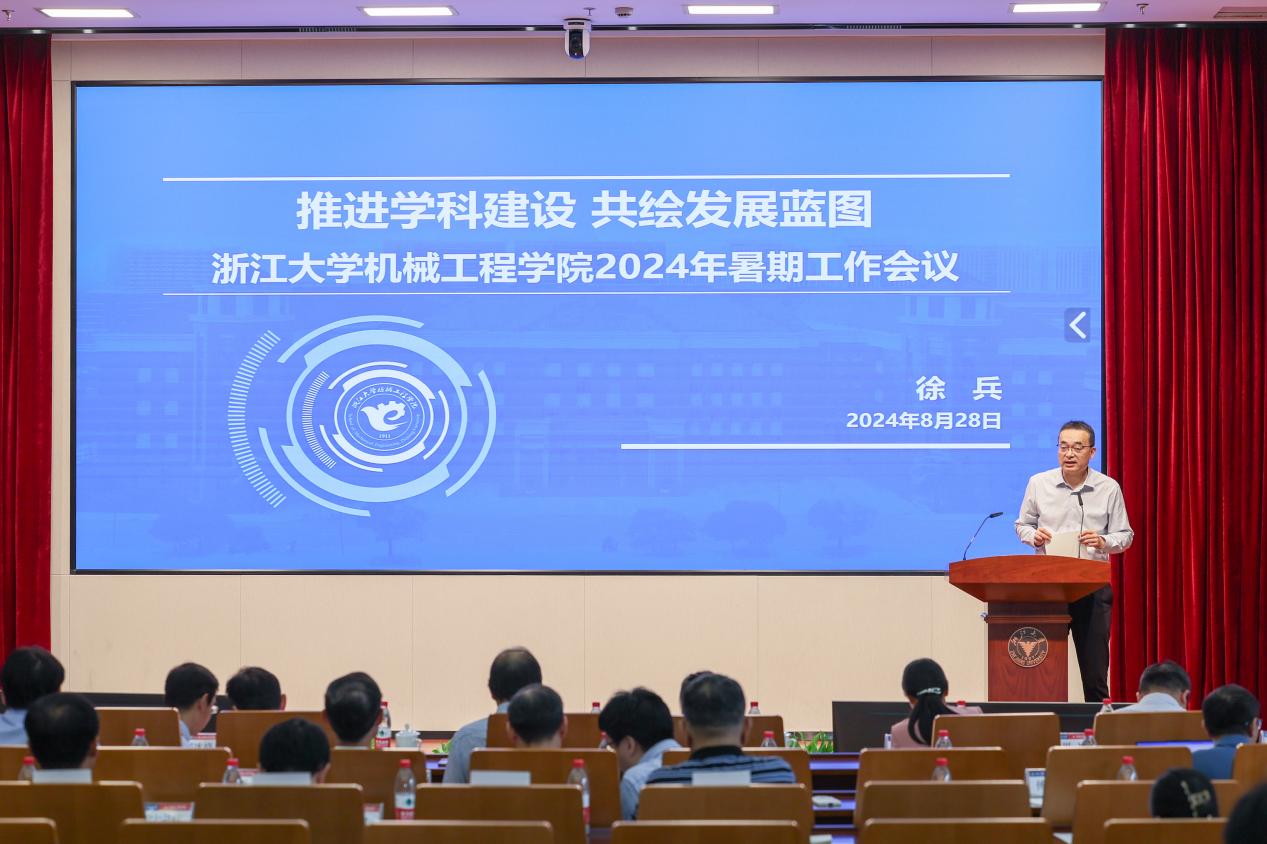 学院常务副院长徐兵代表机械工程学院作题为《推进学科建设 共绘发展蓝图》的报告。他围绕学院党建思政、教育教学、科学研究、人才引育、发展联络等方面汇报了学院2023年以来的整体建设及学科发展情况。他表示,在过去的一年中,在学校各部门的关心和支持下,学院各方面工作稳步提升,取得了显著的成绩。在当前新形势下,学院将紧跟学校创新引领、改革奋进的战略使命,在科研、人才、教育教学等方面开拓新渠道,形成新举措,打造有特色、有实力的国际顶尖机械工程学科,为浙江大学加快迈向世界一流大学前列做出贡献。