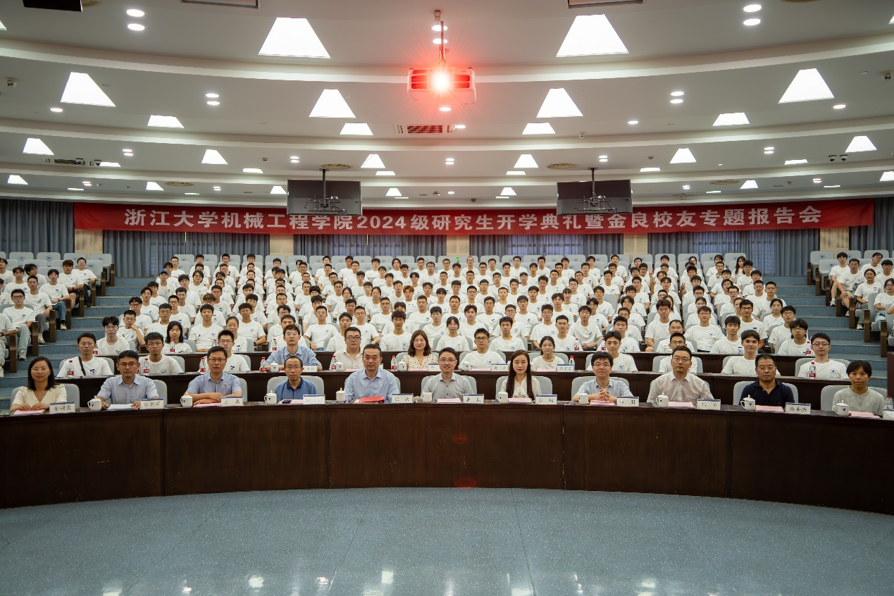 9月8日上午,浙江大学机械工程学院2024级研究生开学典礼在紫金港校区蒙民伟楼举行,学院2004级优秀校友、迅实科技联合创始人及CEO金良,总裁助理张珊受邀出席,金良校友作专题报告。学院常务副院长徐兵,副院长刘振宇、赵朋,党委副书记俞磊,院长助理韩冬等学院领导,发展联络办公室、研究生教学科、团委等科室代表以及部分教师代表出席典礼。全体2024级研究生新生齐聚一堂,共同见证这一难忘的时刻。本次典礼由学院党委副书记俞磊主持。