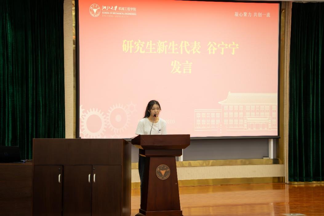 研究生新生代表、2024级机械工程专业硕士研究生谷宁宁表达了对研究生学习生活的期望。她承诺未来会珍惜在浙大的时光,将个人理想与国家发展紧密结合,扎根学术,沉淀自己,为中华民族的伟大复兴做出贡献。