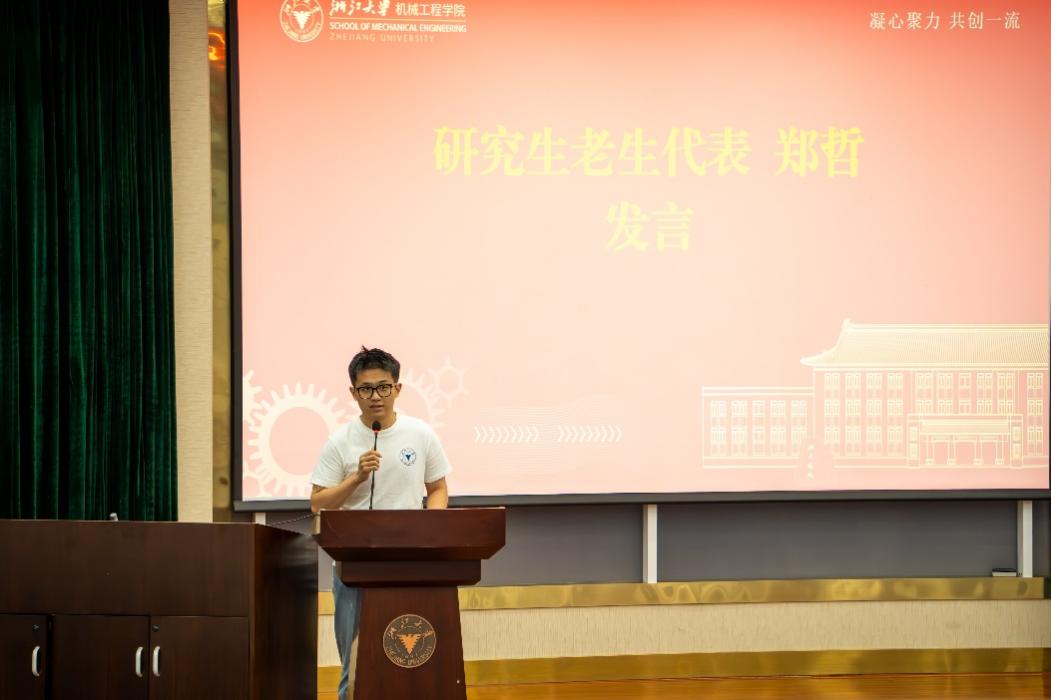 老生代表、2021级博士生郑哲发言。他引用竺可桢校长提出的两个经典问题——“到浙大来做什么?将来毕业后要做什么样的人?”引导学弟学妹们思考科研道路的使命与担当。他从自身经历出发,鼓励大家敢于面对科研的困难,勇敢迎接科研的挑战,在不断探索中找寻自己的方向。