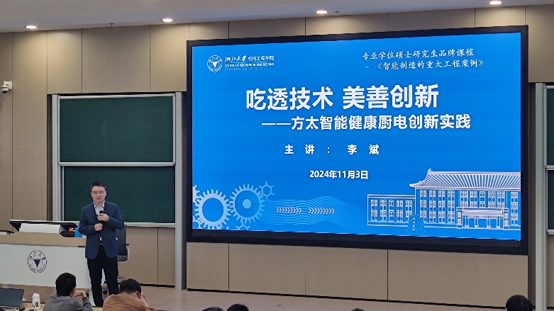 11月3日,宁波方太厨具有限公司中央研究院院长李斌应邀为我院2024级专业学位硕士研究生带来题为《吃透技术 美善创新——方太智能健康厨电创新实践》的精彩报告。