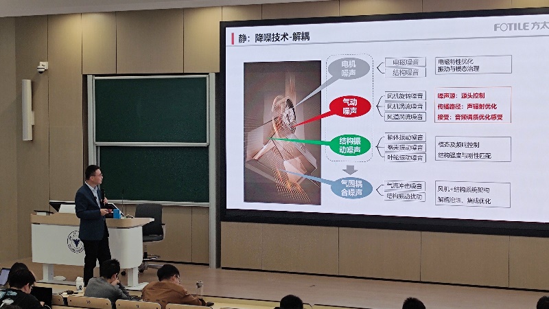 谈及创新实践,李斌院长以抽油烟机的解耦降噪技术为例,从噪声的四大来源:电机噪声、气动噪声、结构振动噪声及气固耦合噪声入手,详细分析了其传播途径以及治理办法,介绍了方太厨具为解决该问题提出的“振动模态治理”、“音频调制优化感受”、“结构强度刚性匹配”、“解耦治理集成优化的”的四大创新技术,为同学们展示了结构设计、空气动力学、多物理场有限元仿真分析在具体工程实践中的应用的生动的实例,深化同学们对智能厨电行业前沿技术及创新实践的理解,同时激发同学们的创新思维和实践能力。