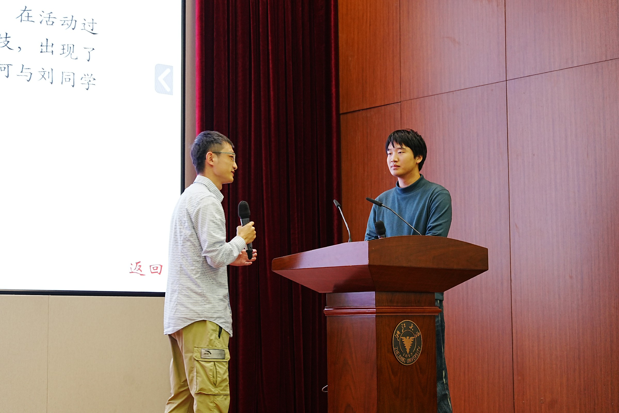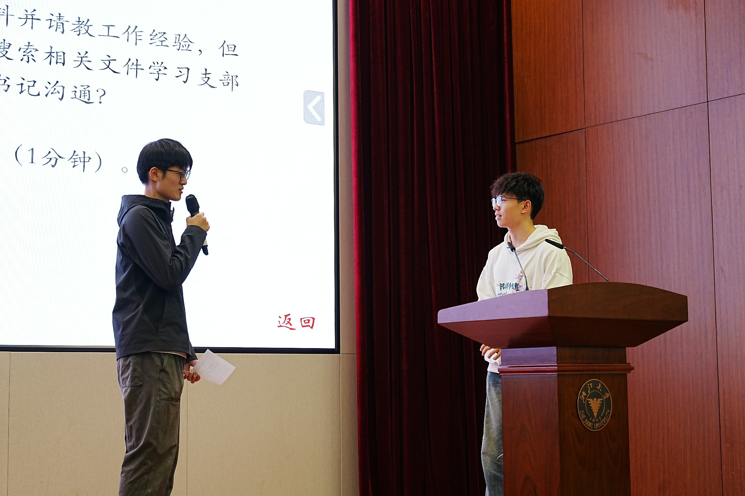 第三个环节是情景模拟环节,需要选手现场抽取题目,每位选手根据提前抽取的题目与助演嘉宾配合现场演绎2分钟,考察参赛者对问题的临时应对能力和妥善解决问题的能力。面对不同对象、不同情景,参赛支书凭借过硬的政治素养和扎实的业务能力沉着应对,熟练引用党章党规,在保持高度的同时不忘温度,细心、耐心、用心解决对方的实际问题,充分展现了作为学生党员骨干在日常工作中积累的过硬能力素质。